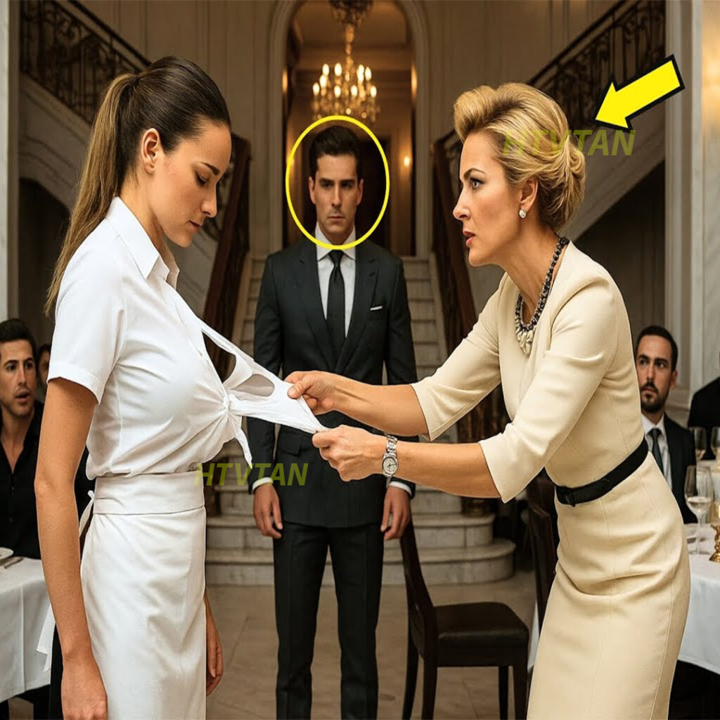tan súbito y descontrolado que chocó directamente contra Isabela, quien tenía en sus manos una bandeja con copas de vino tinto destinadas a otra mesa de comensales importantes. El sonido del cristal rompiéndose contra el suelo de mármol resonó por todo el restaurante como una explosión. El vino se derramó sobre el uniforme de Isabela, creando manchas que se extendían como heridas sangrantes sobre la tela clara. Pero lo más devastador fue el desgarrón brutal que se produjo en la falda del vestido, cuando Isabela, en un intento desesperado de evitar la caída completa, se enredó con la silla.
