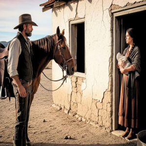 El desierto de Sonora ardía bajo un cielo del color de la sangre seca. Daniel Torres detuvo su caballo frente a la cabaña y sintió que el polvo del camino no era lo único que lo ahogaba. 42 años, viudo desde hacía 6 meses y con un solo deseo en el alma que la tierra se lo tragara en paz. La construcción era más ruina que refugio, paredes de adobe agrietadas, un techo que amenazaba con derrumbarse al primer viento fuerte y ventanas sin vidrios que parecían cuencas vacías mirando la nada.