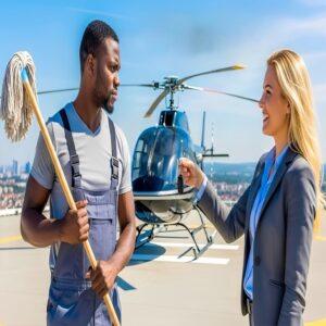 En su mente se repetía la imagen de aquel hombre encendiendo el helicóptero con la seguridad de un experto, quién era realmente y por qué trabajaba allí limpiando pisos. Si la historia te está gustando, no olvides darle like, suscribirte y comentar qué te está pareciendo. Cuando finalmente lo vio entrar a su oficina, el silencio se volvió pesado. Omar se mantuvo de pie con respeto, pero su mirada firme la hizo sentirse expuesta. “No sabía que tenías experiencia en aviación”, dijo ella intentando sonar amable.
