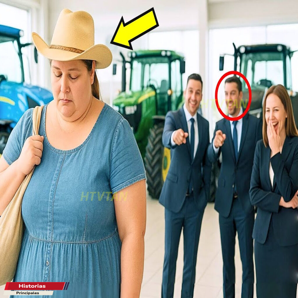 Una mujer obesa con sombrero vaquero entró en la lujosa concesionaria de tractores. “Vas a pagar con pizza.” Se burló un vendedor elegante. No sabía que ella era la acendada más rica de la región, ni que el dueño, observando todo, ya sentía latir su corazón por ella. Los tacones de los ejecutivos resonaban contra el impecable piso de mármol, mientras las risas despectivas llenaban el espacio.