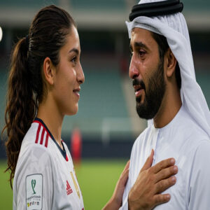 Mientras sus compañeras corrían a abrazarla en el centro del campo, ella hizo algo completamente inesperado. Se separó del grupo de celebración y caminó deliberadamente hacia la línea de banda, directamente frente al palco donde se encontraba el jeque Rashid Al Mansuri. Con la confianza de una reina y la presencia de una guerrera, levantó la vista hacia el palco y con voz clara y potente que resonó por todo el estadio gracias a la proximidad de los micrófonos televisivos, gritó en árabe clásico perfecto.