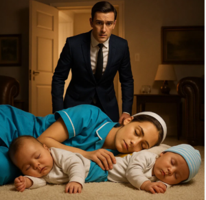 En el suelo, bajo la cálida luz de la lámpara, yacía una joven con un uniforme turquesa. Su cabeza reposaba sobre una toalla doblada, sus oscuras pestañas rozando sus mejillas mientras dormía profundamente. Acurrucados a su lado estaban sus dos hijos de seis meses —sus preciosos gemelos— envueltos en suaves mantas, con sus pequeños puños aferrados a sus brazos.