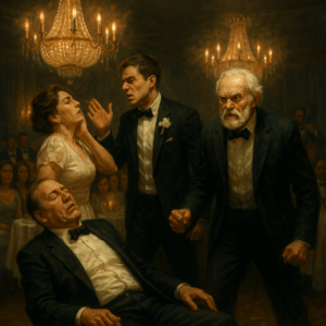El salón, decorado con flores blancas y luces cálidas que antes parecían brillar con alegría, ahora adquiría un aire lúgubre, como si la misma decoración se hubiera transformado en una escenografía cruel para un drama familiar imposible de olvidar. El aroma del vino derramado en el suelo, mezclado con el de las flores marchitas por el calor, se volvía sofocante, y las risas que antes se escuchaban se habían convertido en susurros quebrados, en comentarios cargados de asombro y miedo.