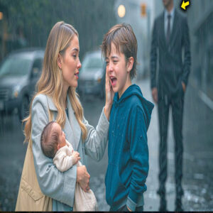 Había pasado los últimos 30 minutos recorriendo las calles después de la llamada desesperada del colegio. Su hijo se había escapado otra vez. Pero lo que veía lo dejó sin palabras. Una mujer joven, claramente de pocos recursos por su ropa sencilla y desgastada, consolaba a Mateo como si fuera su propio hijo. Cargaba un bebé que no podía tener más de 6 meses y aún así había dado su única protección contra la lluvia a un niño desconocido.