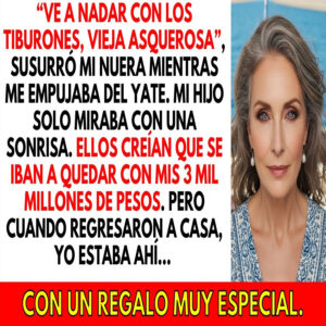 Ve a nadar con los tiburones, vieja asquerosa. Se rió mi nuera mientras me empujaba del yate. Mi hijo solo observaba satisfecho, seguro de que heredaría mis 3,000 millones de pesos. Pero esa misma noche, cuando regresaron a casa, me encontraron viva y con un regalo muy especial en las manos que terminaría destruyéndolos para siempre.