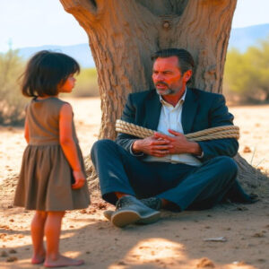 Estaba tan quieto. Un hombre grande, de barba cerrada y traje sucio, amarrado con una cuerda gruesa a un árbol retorcido. Tenía los labios partidos y la camisa empapada de sudor. Cuando lo vio moverse, retrocedió con un susto. “Taxing”, dijo el hombre con voz áspera. “por favor, agua.” Mariela lo observó desde lejos.