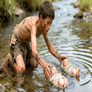 Tiró con todas sus fuerzas, arrastrando el peso hacia la orilla, mientras sus pies resbalaban una y otra vez en las piedras cubiertas de musgo. Cuando finalmente llegó a tierra firme, cayó de rodillas junto a la canasta. Los bebés lloraban. Era un llanto débil, agotado, como si ya hubieran gastado toda su fuerza gritando en la oscuridad.