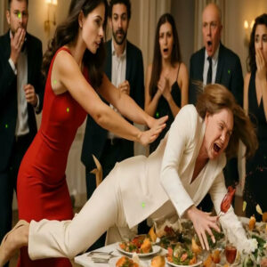 La anciana cayó directamente sobre la mesa, su cuerpo chocando contra platos llenos de comida. Salsa de tomate se esparció por el vestido sencillo que llevaba, manchas rojas formándose en la tela clara. Pedazos de comida volaron en todas direcciones. Los invitados se quedaron paralizados, algunos con las copas aún en el aire, otros con tenedores suspendidos en el camino hacia la boca.