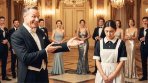 Había en ellos un brillo oculto, un fuego que nadie esperaba encontrar en aquella mujer de uniforme sencillo. El salón, todavía riendo, no imaginaba lo que estaba a punto de suceder. El silencio se adueñó del salón como una sombra inesperada. Las risas que segundos antes se desbordaban ahora flotaban en el aire quebradas inseguras.