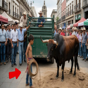 Don Ricardo hizo una llamada y en menos de 30 minutos un enorme camión ganadero se detuvo en la plaza. La multitud había crecido a más de 200 personas, todas curiosas por ver qué iba a pasar con este niño valiente que había aceptado el desafío imposible del multimillonario. Algunos estaban preocupados por la seguridad de Miguel, otros esperaban ver un espectáculo, pero todos sentían que estaban a punto de presenciar algo memorable.