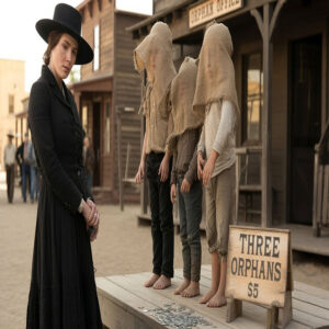Entonces los vio tres niños parados como estatuas, con sacos atados sobre la cabeza y las manos amarradas a la espalda. A sus pies, un cartel pintado a mano decía: “Huérfanos!” D cada uno, “Sin nombre, sin edad.” Marta bajó del carro sin decir palabra. Sus botas golpearon el suelo con la firmeza de quien no pide permiso. Al principio nadie la notó.