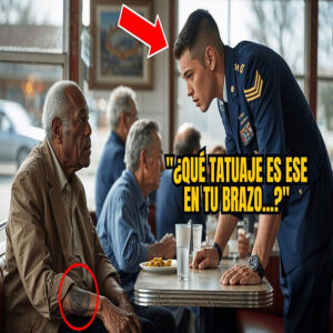 Sus ojos escanearon el ambiente detectando la tensión en el aire incluso antes de comprender la escena. Entonces su mirada se fijó en el tatuaje parcialmente visible en el brazo de Samuel. Riley se quedó paralizado como si hubiera visto un fantasma. “¡Imposible”, susurró avanzando lentamente hacia la mesa de Samuel. El silencio en el restaurante se intensificó cuando Riley se detuvo a dos pasos de distancia, estudiando el rostro envejecido frente a él con una expresión de creciente reconocimiento.
