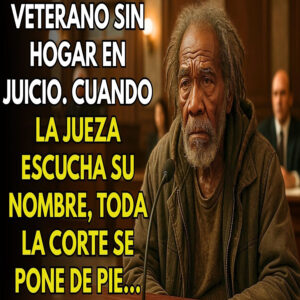 Veteranos sin hogar en juicio. Cuando la jueza oye su nombre, todo el tribunal se pone de pie. Entró esposado, cabizajo, delgado, con un abrigo raído que parecía haber sobrevivido décadas, no estaciones. Los zapatos estaban tan desgastados que uno de sus pies apenas rozaba el suelo. Su rostro mostraba algo más que arrugas. reflejaba abandono.