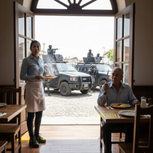 Uno de los hombres armados se acercó a la puerta del restaurante. Clara retrocedió con el plato aún en las manos. El silencio era tan intenso que se escuchaba el golpeteo de su propio corazón. Si la historia te está gustando, no olvides darle like, suscribirte y comentar qué te está pareciendo. El anciano se puso de pie lentamente. Ya no parecía frágil.