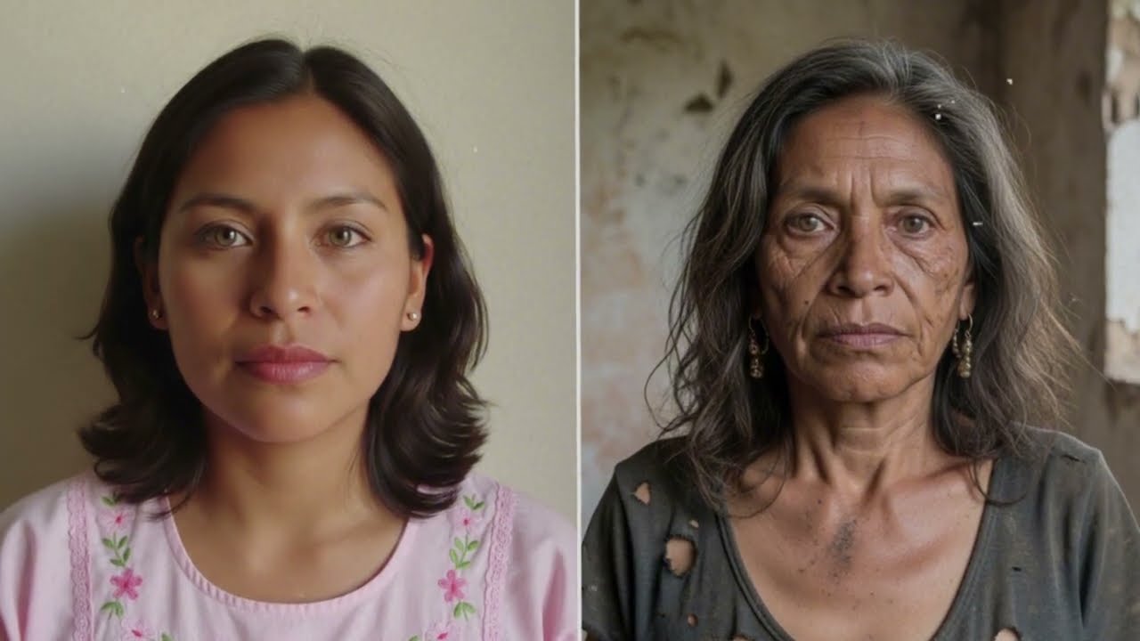 La foto icónica del antes y después. Lucía, joven de 32 años con su blusa rosa bordada, cabello cuidado y sonrisa suave, al lado de la imagen devastadora de ella, a los 54 años, encontrada en el rancho abandonado, cabello largo y gris, rostro destruido, cuerpo esquelético. Sigue circulando por internet ocasionalmente.