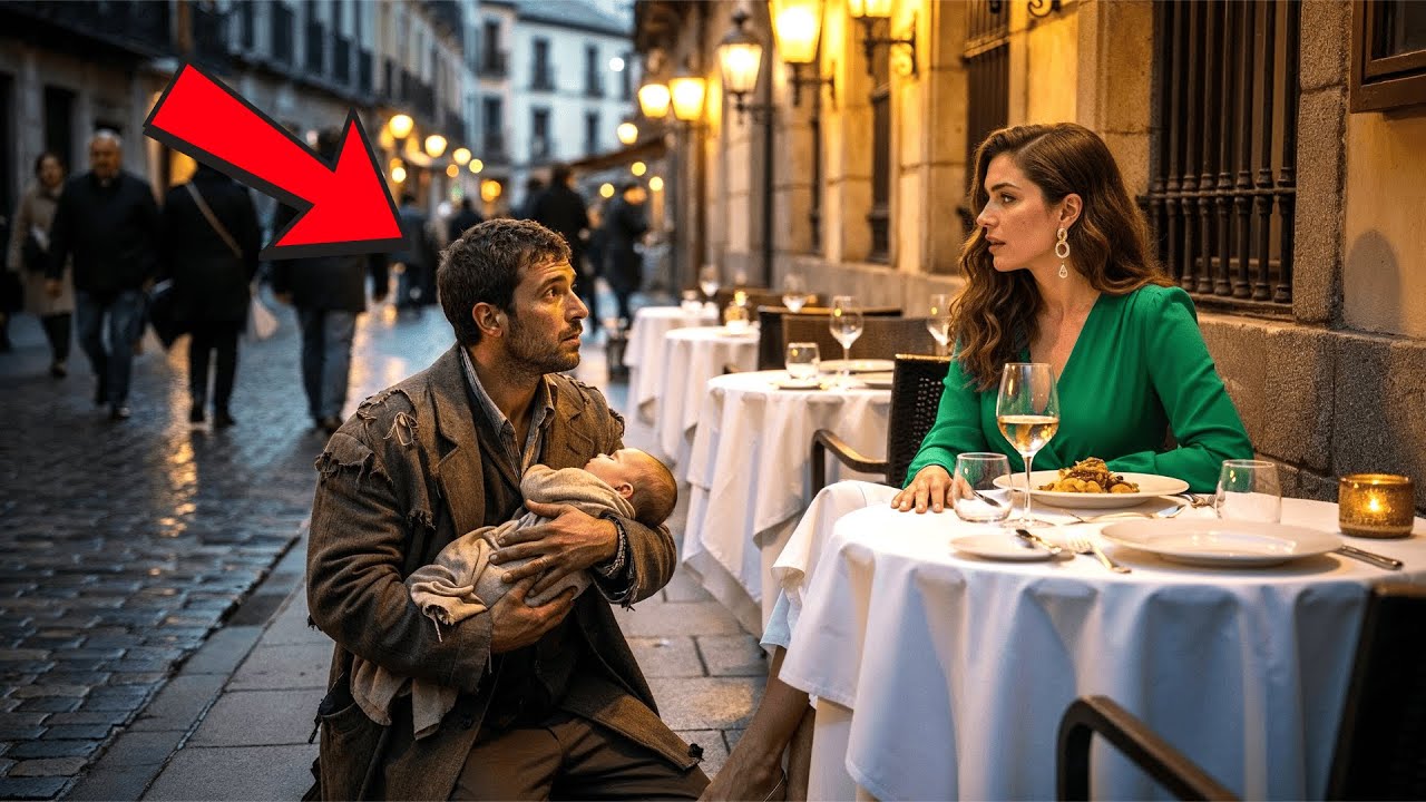 Una millonaria cenaba en el restaurante más exclusivo de Madrid cuando un vagabundo con un bebé en brazos se arrodilló frente a su mesa. “¿Puedo quedarme con sus obras, señora?”, susurró con voz quebrada. Pero cuando ella miró a los ojos de ese bebé de apenas tres meses, vio algo que le heló la sangre. Esos ojos ya los había visto antes.