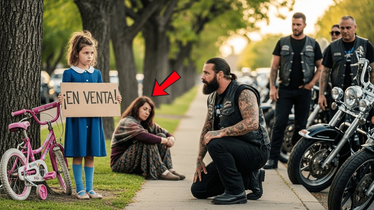 Junto a ella había una bicicleta rosa toda rayada, claramente su único tesoro. Cuando el convoy de 10 motos se detuvo con estruendo de motores y cuero, la niña no huyó. Levantó esos ojos verdes llenos de desesperación y dijo palabras que romperían el corazón de cualquier hombre. Por favor, señor, compre mi bisi. Mamá no come desde hace dos días.