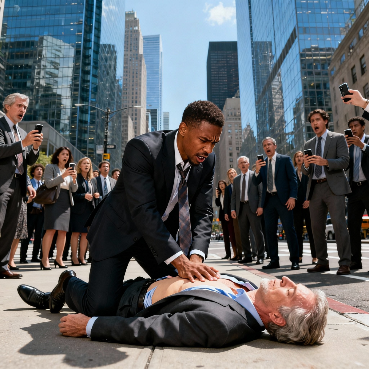 El rostro del hombre estaba lívido, su respiración era débil. Marcus recordó su formación en primeros auxilios de la universidad. Aflojó la corbata del anciano, le tomó el pulso y luego comenzó las compresiones torácicas mientras gritaba a alguien que llamara al 911.
