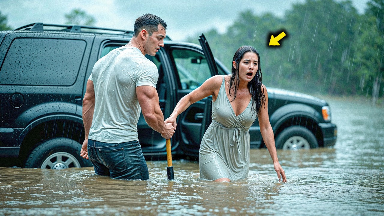 El hombre musculoso que sostenía un machete la miró fijamente, el agua de lluvia corriendo por su camiseta empapada que se pegaba a su cuerpo bien formado. “Agárrese de mi mano ahora”, ordenó él con voz firme, pero tranquilizadora, extendiendo su brazo hacia ella. “La puerta está atascada. Tengo que romper el vidrio. No, espera, déjame intentar abrirla una vez más, suplicó ella, el pánico evidente en su voz mientras seguía forcejeando con la manija.
