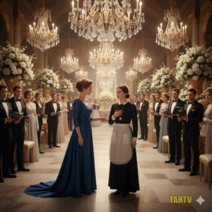 El salón estaba deslumbrante, iluminado por lustres de cristal y decorado con flores blancas y doradas. Era una noche de gala, repleta de invitados importantes y periodistas atentos a cada detalle. En el centro, la multimillonaria Elena desfilaba con elegancia, vestida en un largo azul que realzaba su postura noble. A su alrededor, risas, brindis y aplausos. Todo parecía perfecto hasta que de repente algo interrumpió su serenidad. Entre los funcionarios que servían champán y canapés, una mujer sencilla de uniforme negro y delantal blanco, llamó su atención.