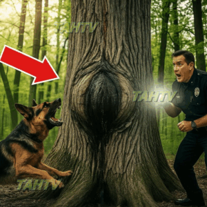 En un bosque silencioso, el oficial Daniel pensó que sería solo otra patrulla rutinaria con su leal perro K9. Pero todo cambió cuando el perro se detuvo de repente con el pelo erizado, ladrando furiosamente hacia un roble antiguo. El oficial Daniel siguió la mirada de su perro y notó algo inquietante, un bulto masivo y antinatural que sobresalía del tronco.
