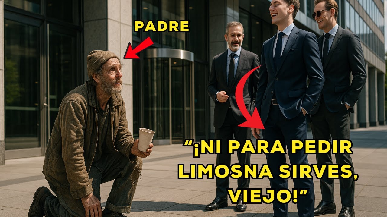 Vestía un traje italiano, hablaba con dos amigos de su misma edad y reía a carcajadas. Todo en su porte gritaba orgullo. Hernán tragó saliva, apretó los dientes bajo su barba falsa y levantó la mano temblorosa hacia él. Joven, ¿podría darme una moneda para comer hoy? dijo con voz apagada, disfrazando su timbre grave. Adrián lo miró de arriba a abajo con un gesto de fastidio. Sus amigos rieron.