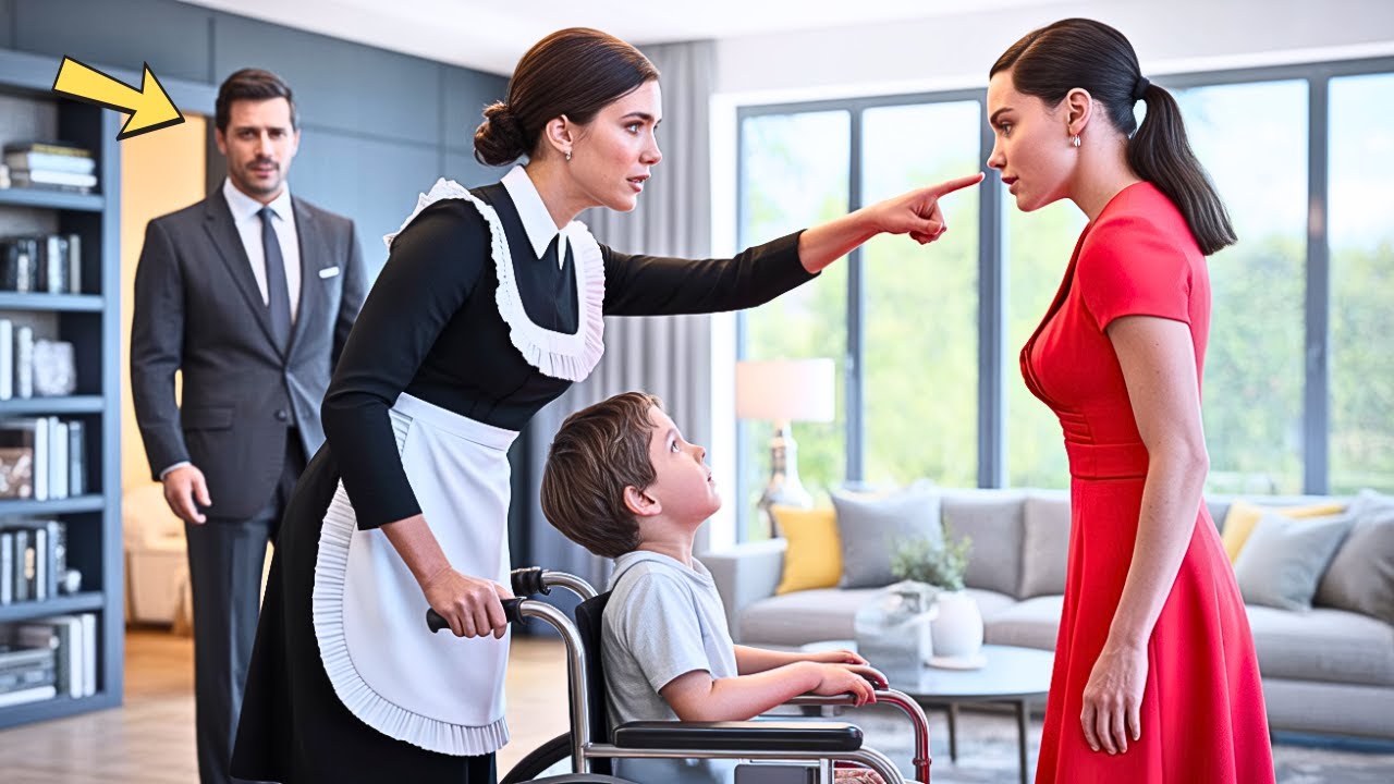 El niño en silla de ruedas de 7 años intentaba contener el llanto mientras su madrastra lo humillaba sin piedad. Pero antes de que ella dijera algo peor, la empleada doméstica apareció en la puerta y gritó, “¡No hagas eso.” La voz resonó por toda la sala. El millonario, que acababa de llegar, quedó paralizado al ver la escena.
