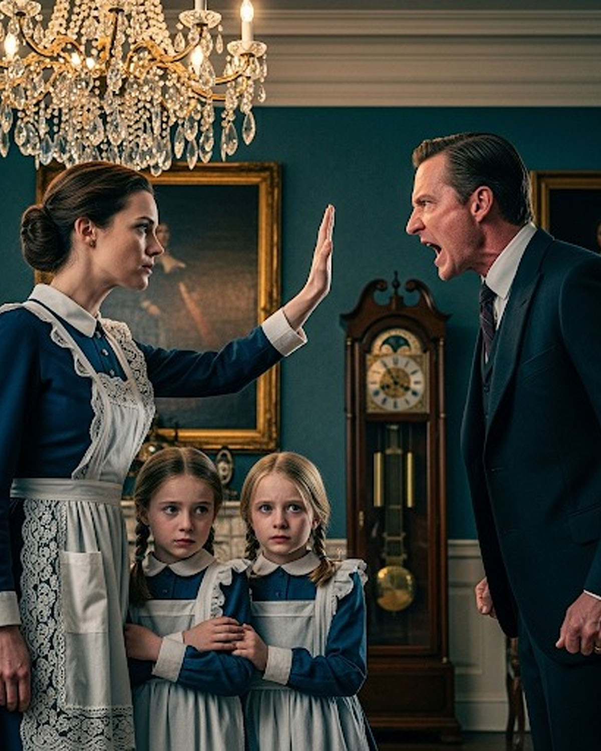 Aquel martes de noviembre, el destino puso en marcha los engranajes de la venganza. Las gemelas estaban sentadas en el sofá dorado del salón principal, idénticas en sus vestidos azul marino de colegio privado. Cuando Isabel pasó limpiando, Lucía, la más valiente de las dos, le pidió agua, un gesto inocente que desató el infierno. Carlos materializó desde su despacho como un depredador herido. Su grito hizo vibrar los cristales del candelabro del siglo XVII mientras cruzaba el salón con pasos que prometían violencia.
