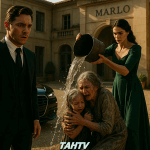 La luz de la mañana se reflejaba sobre las enormes puertas de hierro de la finca Marlo, pintando los detalles dorados con un resplandor casi celestial. Sin embargo, dentro de esos muros lo que ocurría estaba lejos de ser celestial. Una mujer con un elegante vestido esmeralda se erguía altiva, su rostro torcido por el desprecio, mientras inclinaba un pesado balde de agua sucia sobre una anciana y una niña pequeña.
