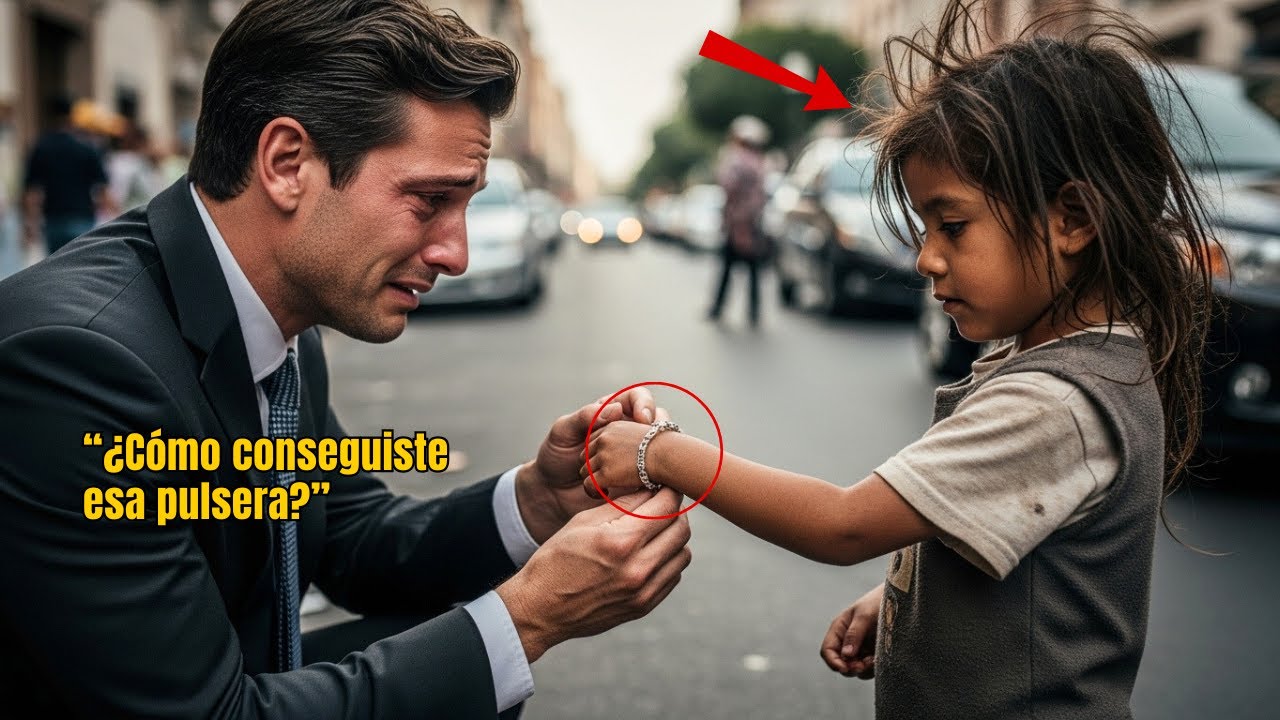 En medio de la concurrida calle de Los Ángeles, un hombre de traje caro se arrodilla ante una niña descalsa. El sonido de las bocinas se mezcla con el silencio que los envuelve, como si el mundo se hubiera detenido por un instante. Él sostiene sus pequeñas manos y mira fijamente la pulsera plateada en su muñeca, la misma que él había puesto años atrás en el brazo frío de su esposa dentro de un ataúd. Sus ojos se humedecen, la respiración le falla.