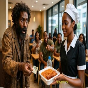 —No se merece sobras, señor —le dijo la camarera al hombre sin hogar que estaba de pie en el centro de un elegante restaurante de Lagos, sosteniendo un pequeño billete arrugado de 200 nairas en su mano temblorosa. Una camarera de mirada amable llamada Amanda acababa de colocar frente a él un paquete caliente de arroz jolof con pollo y una botella de agua.
