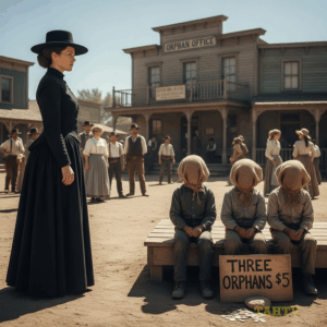Entonces los vio tres niños parados como estatuas, con sacos atados sobre la cabeza y las manos amarradas a la espalda. A sus pies, un cartel pintado a mano decía: “Huérfanos!” D cada uno, “Sin nombre, sin edad.” Marta bajó del carro sin decir palabra. Sus botas golpearon el suelo con la firmeza de quien no pide permiso. Al principio nadie la notó.