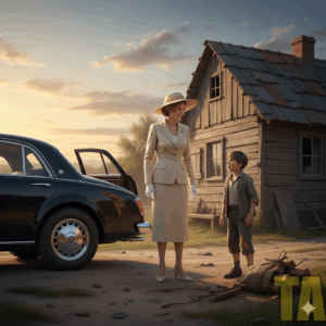 Sin embargo, al llegar, notó algo extraño, el sonido de un motor acercándose por el camino de tierra. Era un auto negro, reluciente, como los que solo había visto en revistas viejas. El vehículo se detuvo justo frente a su puerta. Diego, asustado, dejó caer el saco. De la parte trasera bajó una mujer elegante, alta, vestida con un traje color crema, un sombrero ancho y guantes blancos que brillaban bajo el sol.